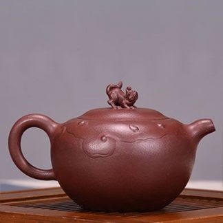 The lid of this handmade teapot forms a wonderful Pi Xiu, providing a built-in tea pet atop the traditional teapot. The clouds along the pot’s body resonate with the creature, as they further implicate good luck; and then the swollen body of the pot has enough space for tea leaves to stretch, fully releasing the sweet, mellow tastes of the tea.